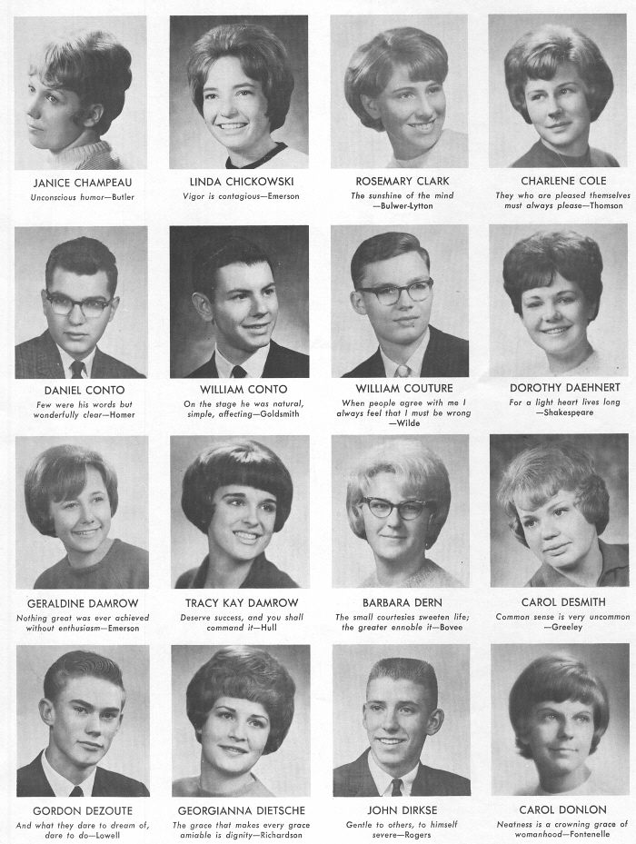 1965 Sheboygan South High School, Page 31: Janice Champeau, Linda Chickowski, Rosemary Clark, Charlene Cole, Daniel Conto, William Conto, William Couture, Dorothy Daehnert, Geraldine Damrow, Tracy Damrow, Barbara Dern, Carol Desmith, Gordon Dezoute, Georgianna Dietsche, John Dirkse, Carol Donlon.