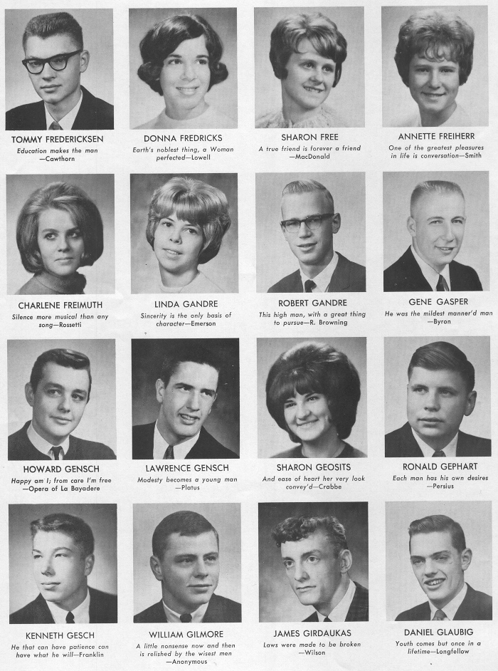 1965 Sheboygan South High School, Page 34: Tommy Fredericksen, Donna Fredricks, Sharon Free, Annette Freiherr, Charlene Freimuth, Linda Gandre, Robert Gandre, Gene Gasper, Howard Gensch, Lawrence Gensch, Sharon Geosits, Ronald Gephart, Kenneth Gesch, William Gilmore, James Girdaukas, Daniel Glaubig.