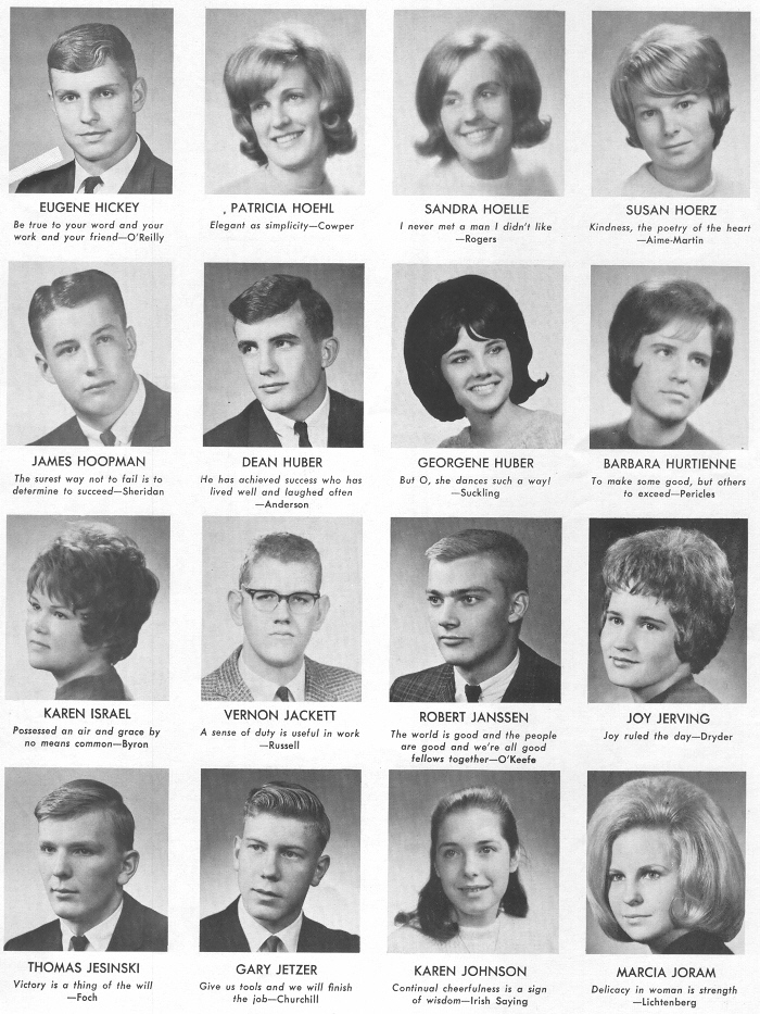1965 Sheboygan South High School, Page 37: Eugene Hickey, Patricia Hoehl Sandra Hoelle, Susan Hoerz, James Hoopman, Dean Huber, Georgene Huber, Barbara Hurtienne, Karen Israel, Vernon Jackett, Robert Janssen, Joy Jerving, Thomas Jesinski, Gary Jetzer, Karen Johnson, Marcia Joram.