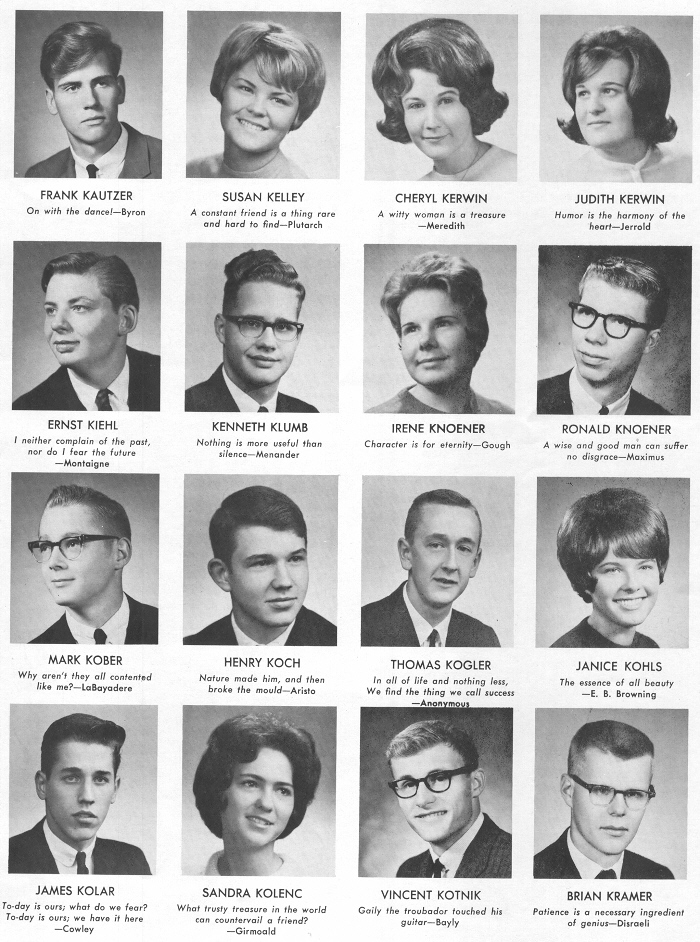 1965 Sheboygan South High School, Page 39: Frank Kautzer, Susan Kelley, Cheryl Kerwin, Judith Kerwin, Ernst Kiehl, Kenneth Klumb, Irene Knoener, Ronald Knoener, Mark Kober, Henry Koch, Thomas Kogler, Janice Kohls, James Kolar, Sandra Kolenc, Vincent Kotnik, Brian Kramer.