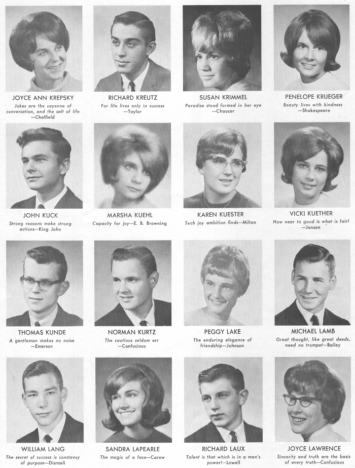 1965 Sheboygan South High School, Page 40: Joyce Ann Krepsky, Richard Kreutz, Susan Krimmel, Penelope Krueger, John Kuck, Marsha Kuehl, Karen Kuester, Vicki Kuether, Thomas Kunde, Norman Kurtz, Peggy Lake, Michael Lamb, William Lang, Sandra Lapearle, Richard Laux, Joyce Lawrence.