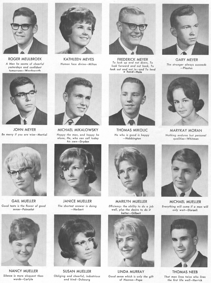 1965 Sheboygan South High School, Page 43: Roger Meulbroek, Kathleen Meves, Frederick Meyer, Gary Meyer, John Meyer, Michael Mikalowsky, Thomas Mikolic, Marykay Moran, Gail Mueller, Janice Mueller, Marilyn Mueller, Michael Mueller, Nancy Mueller, Susan Mueller, Linda Murray, Thomas Neeb.