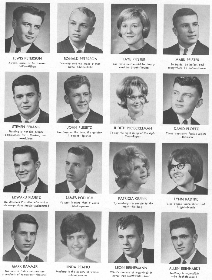 1965 Sheboygan South High School, Page 45: Lewis Peterson, Ronald Peterson, Faye Pfister, Mark Pfister, Steven Pfrang, John Plesetz, Judith Ploeckelman, David Ploetz, Edward Ploetz, James Podlich, Patricia Quinn, Lynn Radtke, Mark Rammer, Linda Reano, Leon Reinemann, Allen Reinhardt.