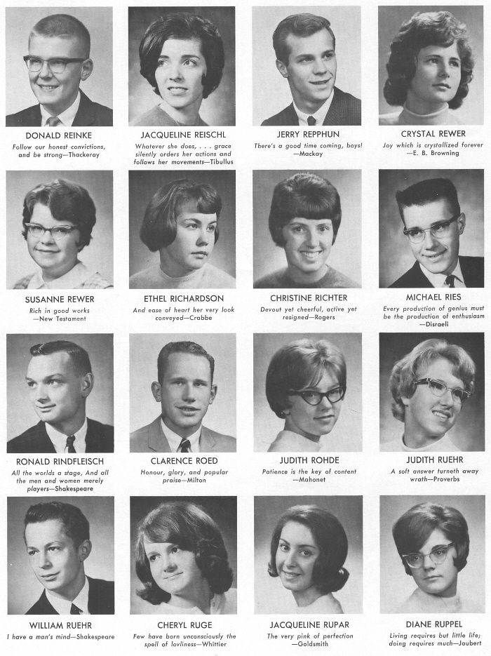 1965 Sheboygan South High School, Page 46: Donald Reinke, Jacqueline Reischl, Jerry Repphun, Crystal Rewer, Susanne Rewer, Ethel Richardson, Christine Richter, Michael Ries, Ronald Rindfleisch, Clarence Roed, Judith Rohde, Judith Ruehr, William Ruehr, Cheryl Ruge, Jacqueline Rupar, Diane Ruppel.