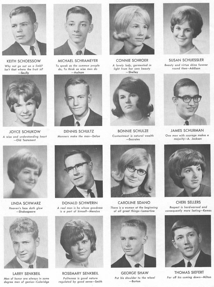 1965 Sheboygan South High School, Page 48: Keith Schoessow, Michael Schrameyer, Connie Schroer, Susan Schuessler, Joyce Schukow, Dennis Schultz, Bonnie Schulze, James Schurman, Linda Schwarz, Donald Schwerin, Caroline Sdano, Cheri Sellers, Larry Senkbeil, Rosemary Senkbeil, George Shaw, Thomas Siefert.