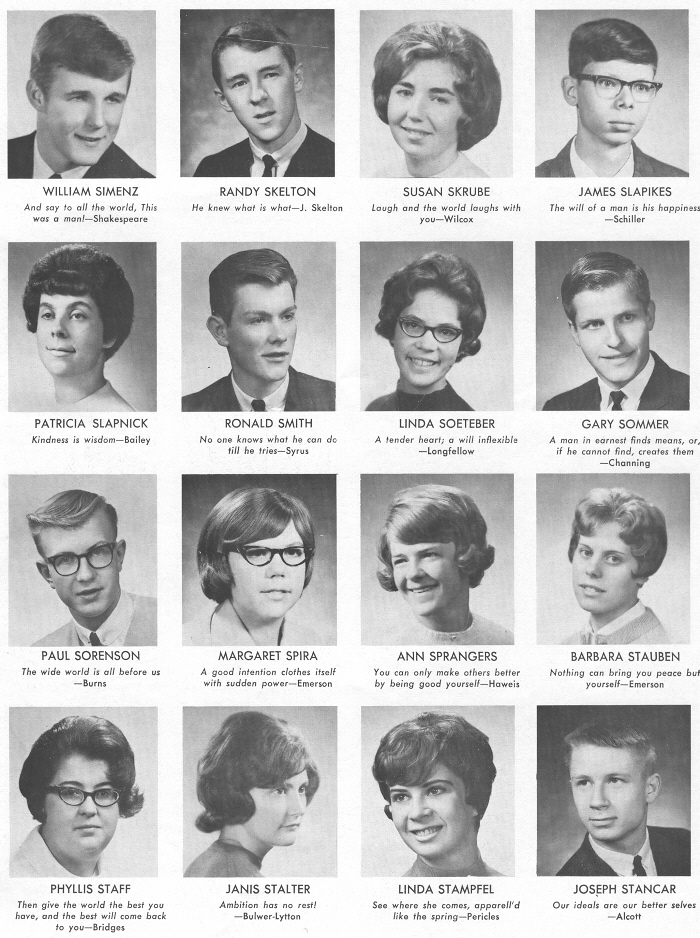 1965 Sheboygan South High School, Page 49: William Simenz, Randy Skelton, Susan Skrube, James Slapikes, Patricia Slapnick, Ronald Smith, Linda Soeteber, Gary Sommer, Paul Sorenson, Margaret Spira, Ann Sprangers, Barbara Stauben, Phyllis Staff, Janis Stalter, Linda Stempfel, Joseph Stancar.