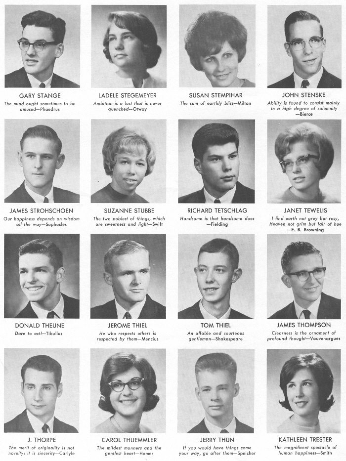 1965 Sheboygan South High School, Page 50: Gary Stange, Ladele Stegemeyer, Susan Stempihar, John Stenske, James Strohschoen, Suzanne Stubbe, Richard Tetschlag, Janet Tewelis, Donald Theune, Jerome Thiel, Tom Thiel, James Thompson, J. Thorpe, Carol Thuemmler, Jerry Thun, Kathleen Trester.