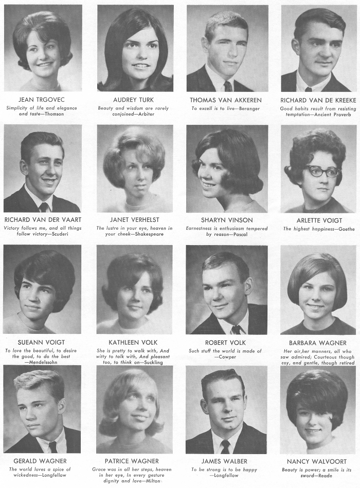 1965 Sheboygan South High School, Page 51: Jean Trgovec, Audrey Turk, Thomas Van Akkeren, Richard Van De Kreeke, Richard Van Der Vaart, Janet Verhelst, Sharyn Vinson, Arlette Voigt, Sueann Voigt, Kathleen Volk, Robert Volk, Barbara Wagner, Gerald Wagner, Patrice Wagner, James Walber, Nancy Walvoort.