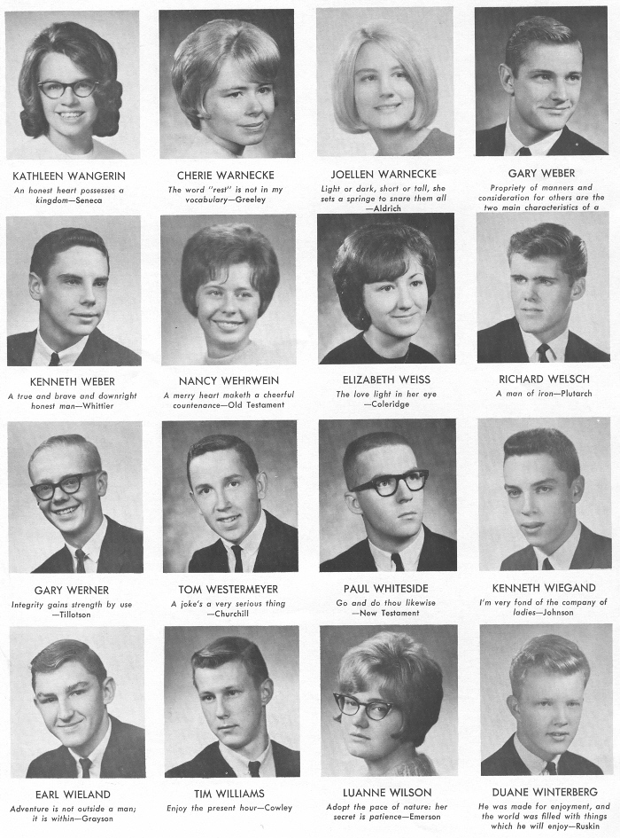 1965 Sheboygan South High School, Page 52: Kathleen Wangerin, Cherie Warnecke, Joellen Warnecke, Gary Weber, Kenneth Weber, Nancy Wehrwein, Elizabeth Weiss, Richard Welsch, Gary Werner, Tom Westermeyer, Paul Whiteside, Kenneth Wiegand, Earl Wieland, Tim Williams, Luanne Wilson, Duane Winterberg.