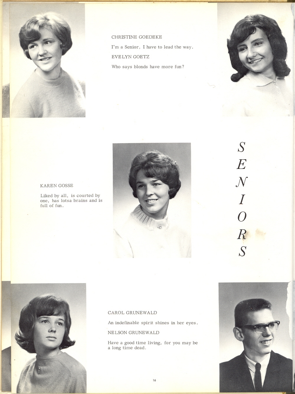 1966 Howards Grove High School, Page 16: Christine Goedeke, Evelyn Goetz, Karen Gosse, Carol Grunewald, Nelson Grunewald.