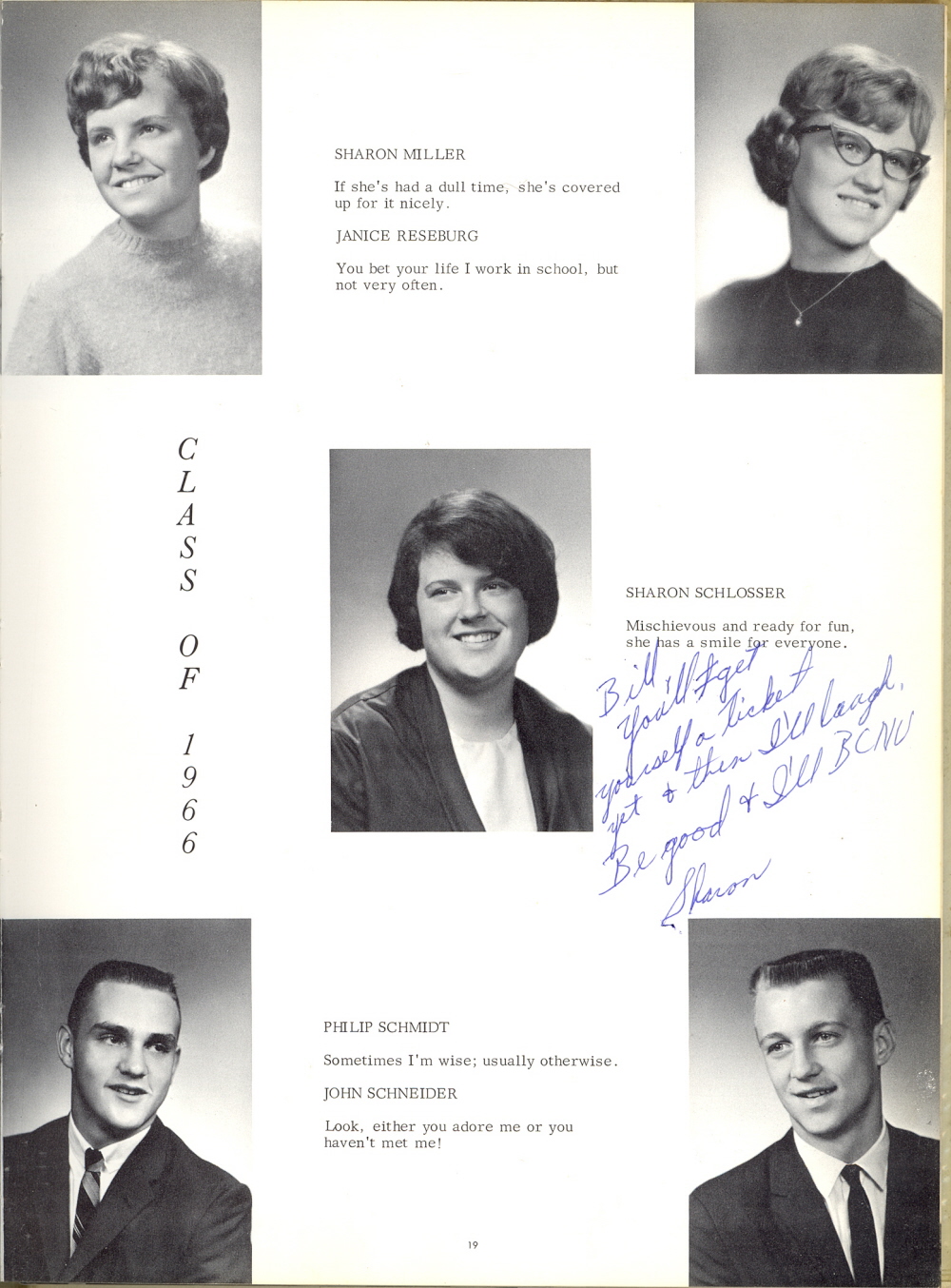 1966 Howards Grove High School, Page 19: Sharon Miller, Janice Reseburg, Sharon Schlosser, Philip Schmidt, John Schneider.
