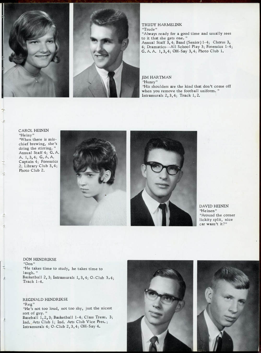 1966 Oostburg High School Yearbook Page 11: Trudy Harmelink, Jim Hartman, Carol Heinen, David Heinen, Don Hendrikse, Reginald Hendrikse.