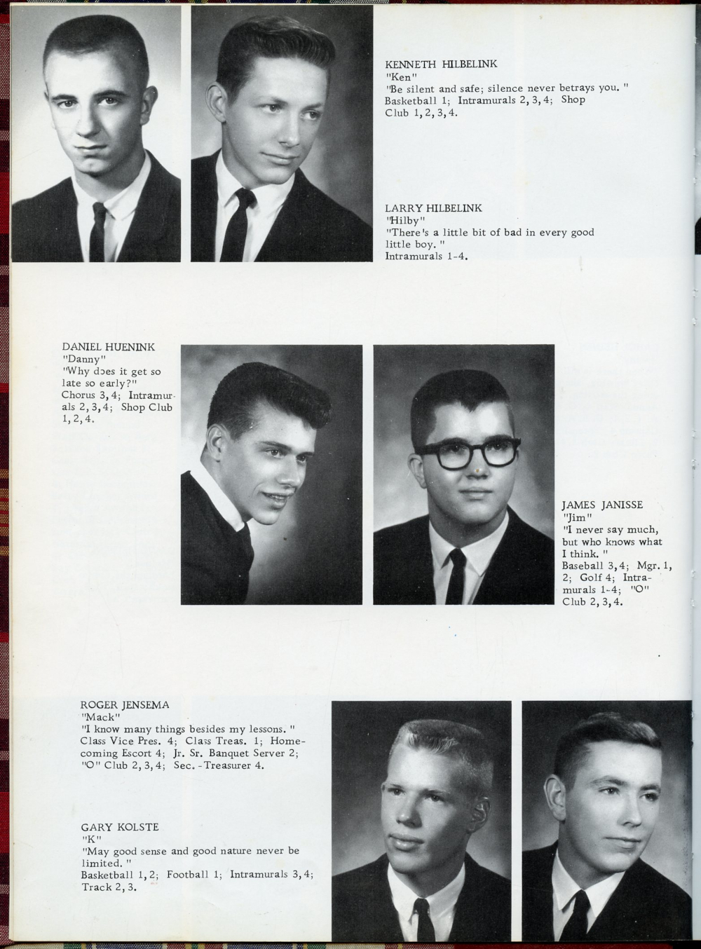 1966 Oostburg High School Yearbook Page 12: Kenneth Hilbelink, Larry Hilbelink, Daniel Huenink, James Janisse, Roger Jensema, Gary Kolste.