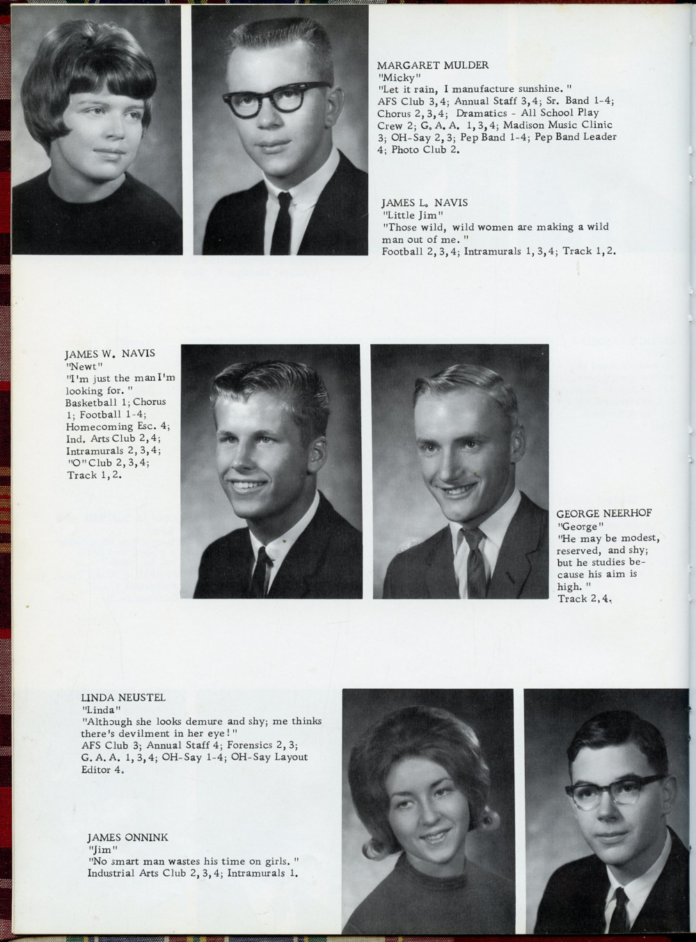 1966 Oostburg High School Yearbook Page 14: Margaret Mulder, James L. Navis, James W. Navis, George Neerhof, Linda Neustel, James Onnink.