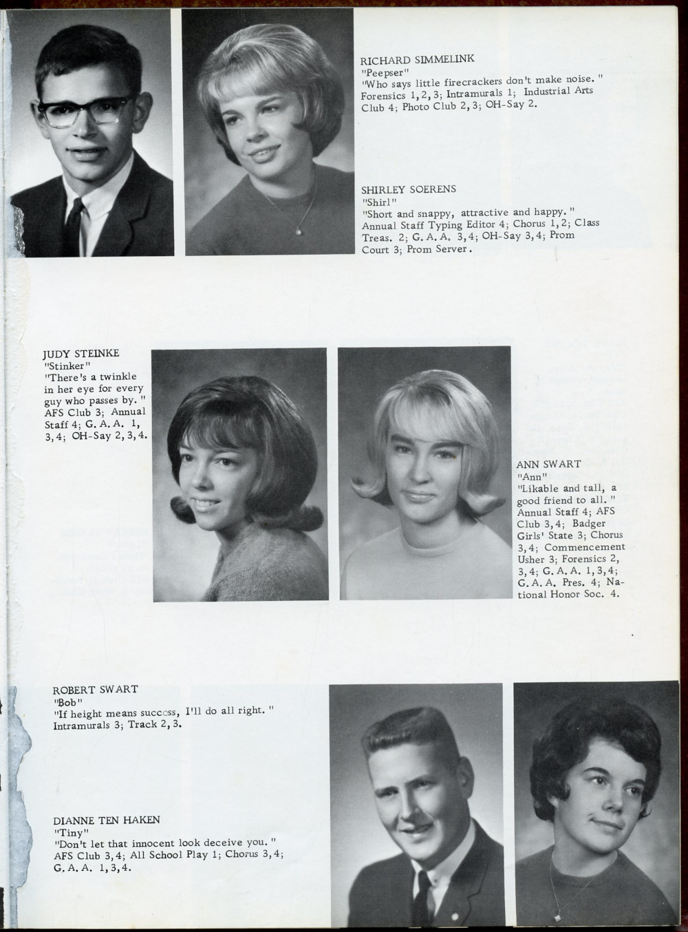 1966 Oostburg High School Yearbook Page 17: Richard Simmelink, Shirley Soerens, Judy Steinke, Ann Swart, Robert Swart, Dianne Ten Haken.