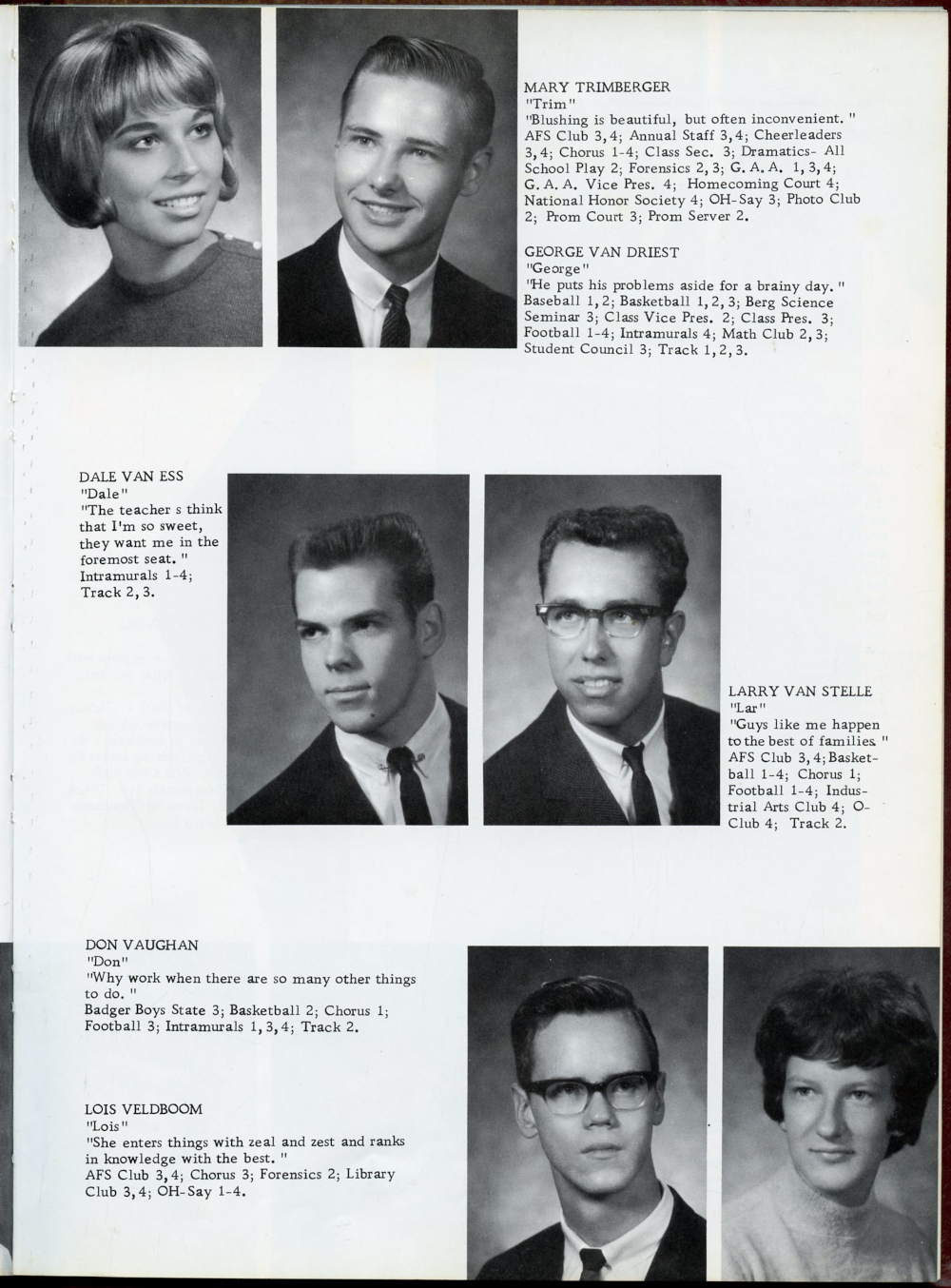 1966 Oostburg High School Yearbook Page 19: Mary Trimberger, George Van Driest, Dale Van Ess, Larry Van Stelle, Don Vaughan, Lois Veldboom.