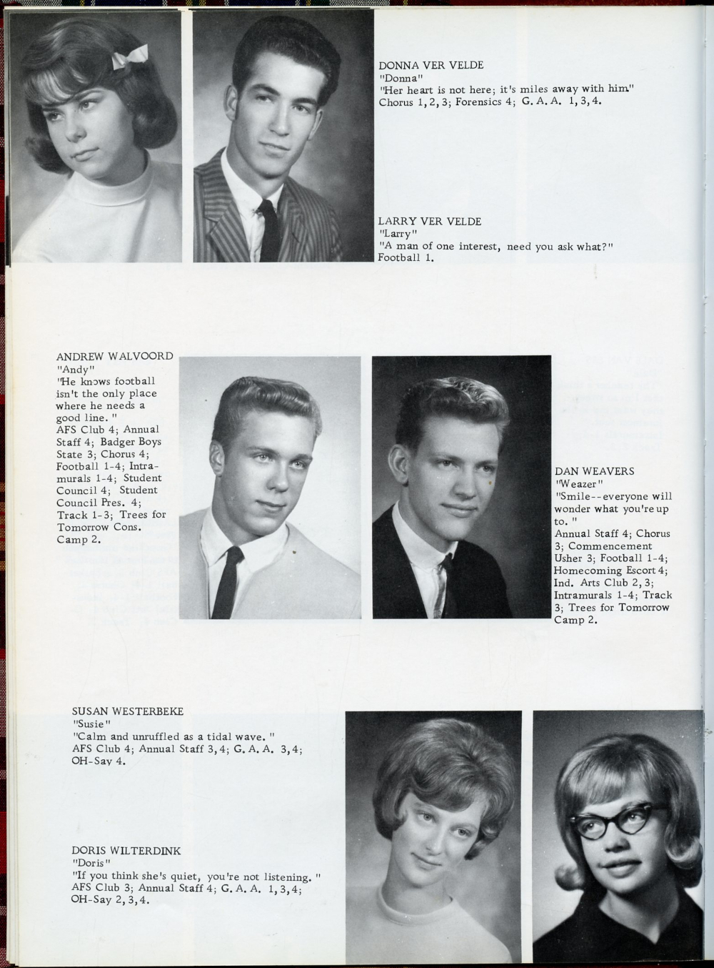 1966 Oostburg High School Yearbook Page 20: Donna Ver Velde, Larry Ver Velde, Andrew Walvoord, Dan Weavers, Susan Westerbeke, Doris Wilterdink.
