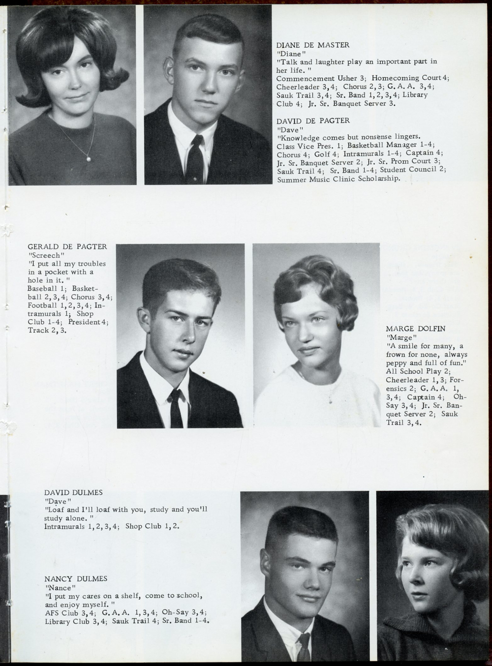 1966 Oostburg High School Yearbook Page 9: Diane De Master, David De Pagter, Gerald De Pagter, Marge Dolfin, David Dulmes, Nancy Dulmes.
