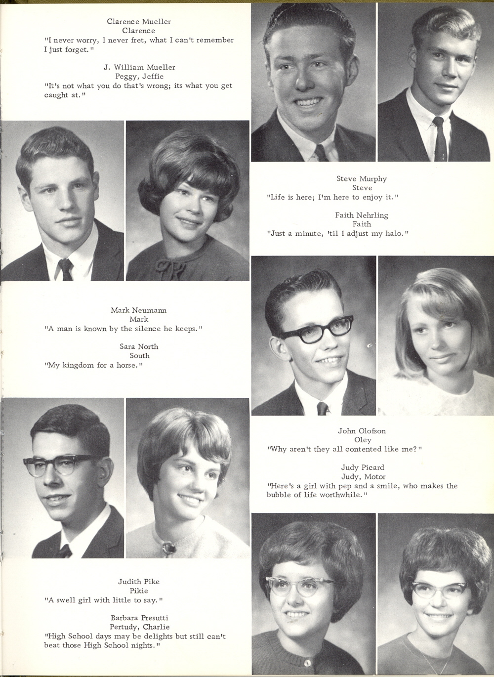 1966 Sheboygan Falls High School, Page 13: Clarence Mueller, J. William Mueller, Steve Murphy, Faith Nehrling, Mark Neumann, Sara North, John Olofson, Judy Picard, Judith Pike, Barbara Presutti.