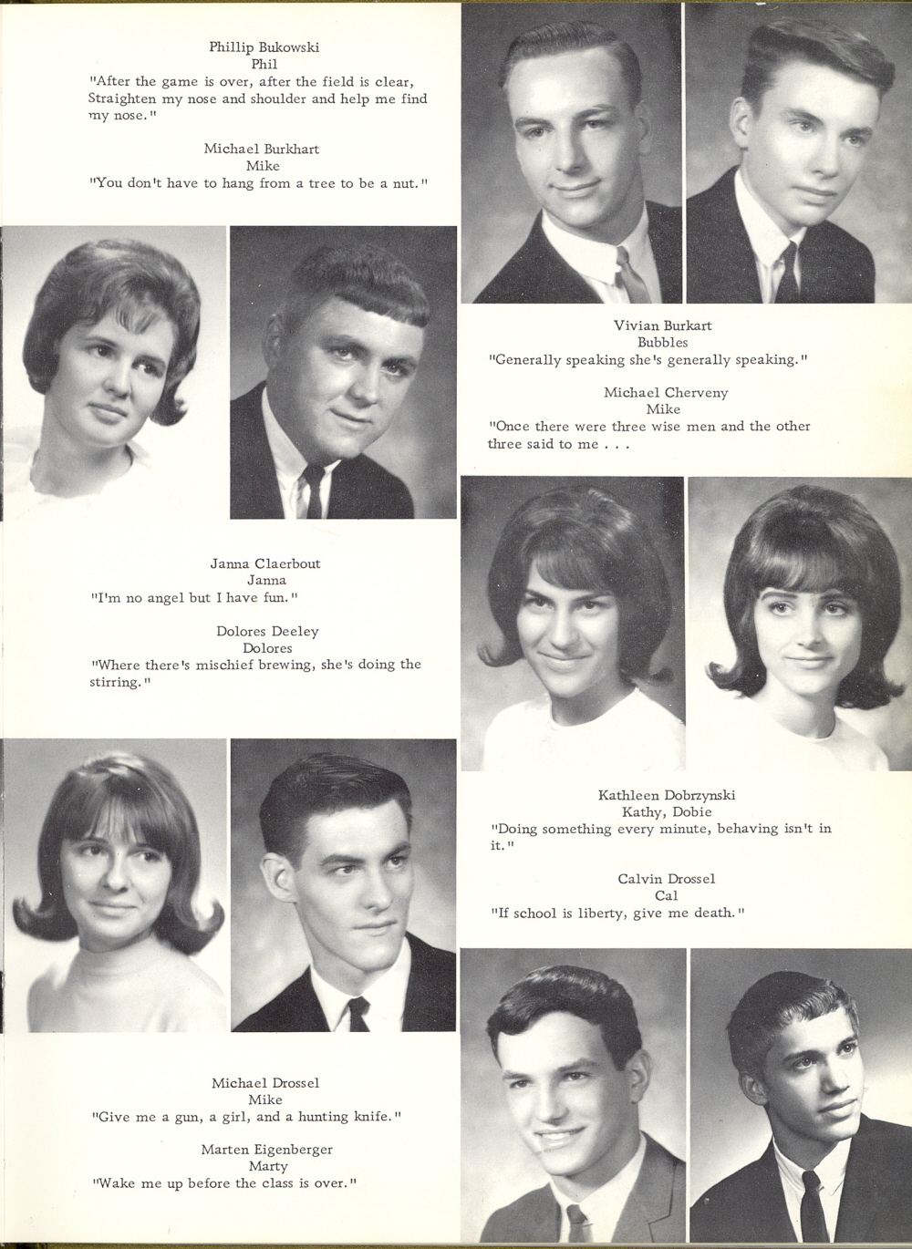 1966 Sheboygan Falls High School, Page 7: Phillip Bukowski, Michael Burkhart, Vivian Burkart, Michael Cherveny, Janna Claerbout, Dolores Deeley, Kathleen Dobrzynski, Calvin Drossel, Michael Drossel, Marten Eigenberger.