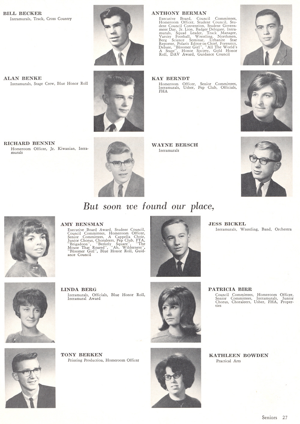 1966 Sheboygan North High School, Page 27: Bill Becker, Alan Benke, Richard Bennin, Amy Bensman, Linda Berg, Tony Berken, Anthony Berman, Kay Berndt, Wayne Bersch, Jess Bickel, Patricia Birr, Kathleen Bowden.