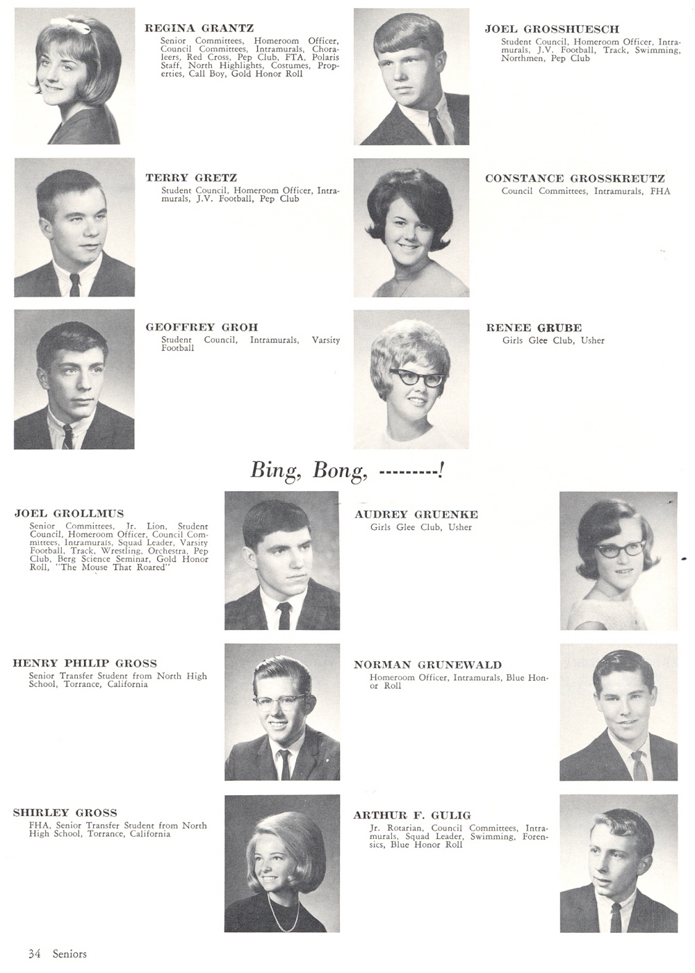 1966 Sheboygan North High School, Page 34: Regina Grantz, Terry Gretz, Goeffrey Groh, Joel Grollmus, Henry Philip Gross, Shirley Gross, Joel Grosshuesch, Constance Grosskreutz, Renee Grube, Audrey Gruenke, Norman Grunewald, Arthur F. Gulig.