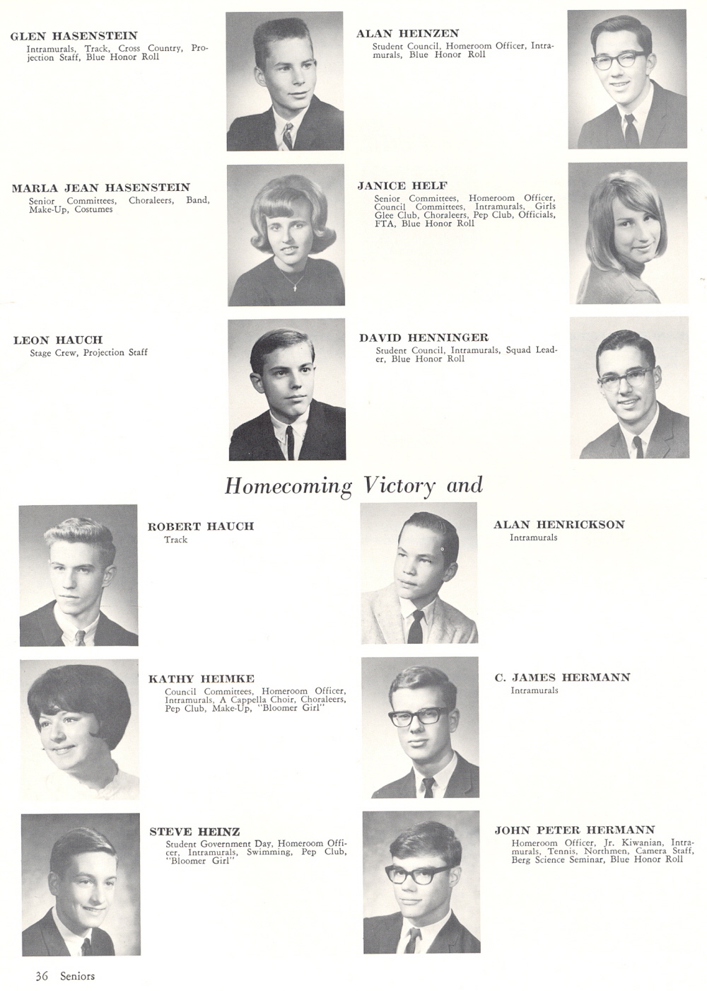1966 Sheboygan North High School, Page 36: Glen Hasenstein, Marla Jean Hasenstein, Leon Hauch, Robert Hauch, Kathy Heimke, Steve Heinz, Alan Heinzen, Janice Helf, David Henninger, Alan Henrickson, C. James Hermann, John Peter Hermann.