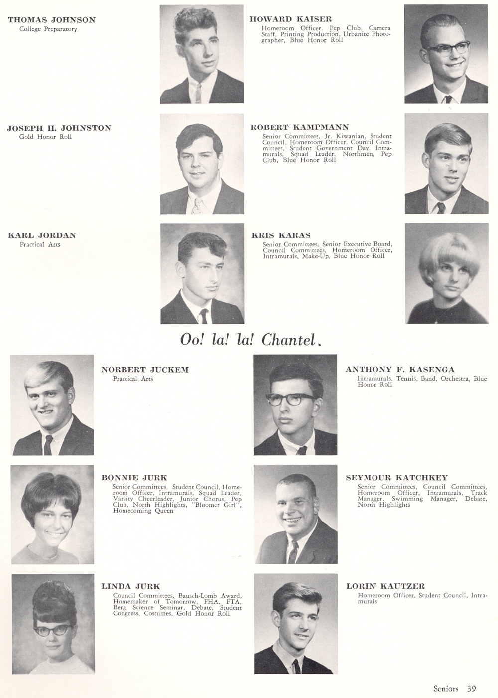 1966 Sheboygan North High School, Page 39: Thomas Johnson, Joseph H. Johnston, Karl Jordan, Norbert Juckem, Bonnie Jurk, Linda Jurk, Howard Kaiser, Robert Kampmann, Kris Karas, Anthony F. Kasenga, Seymour Katchkey, Lorin Kautzer.
