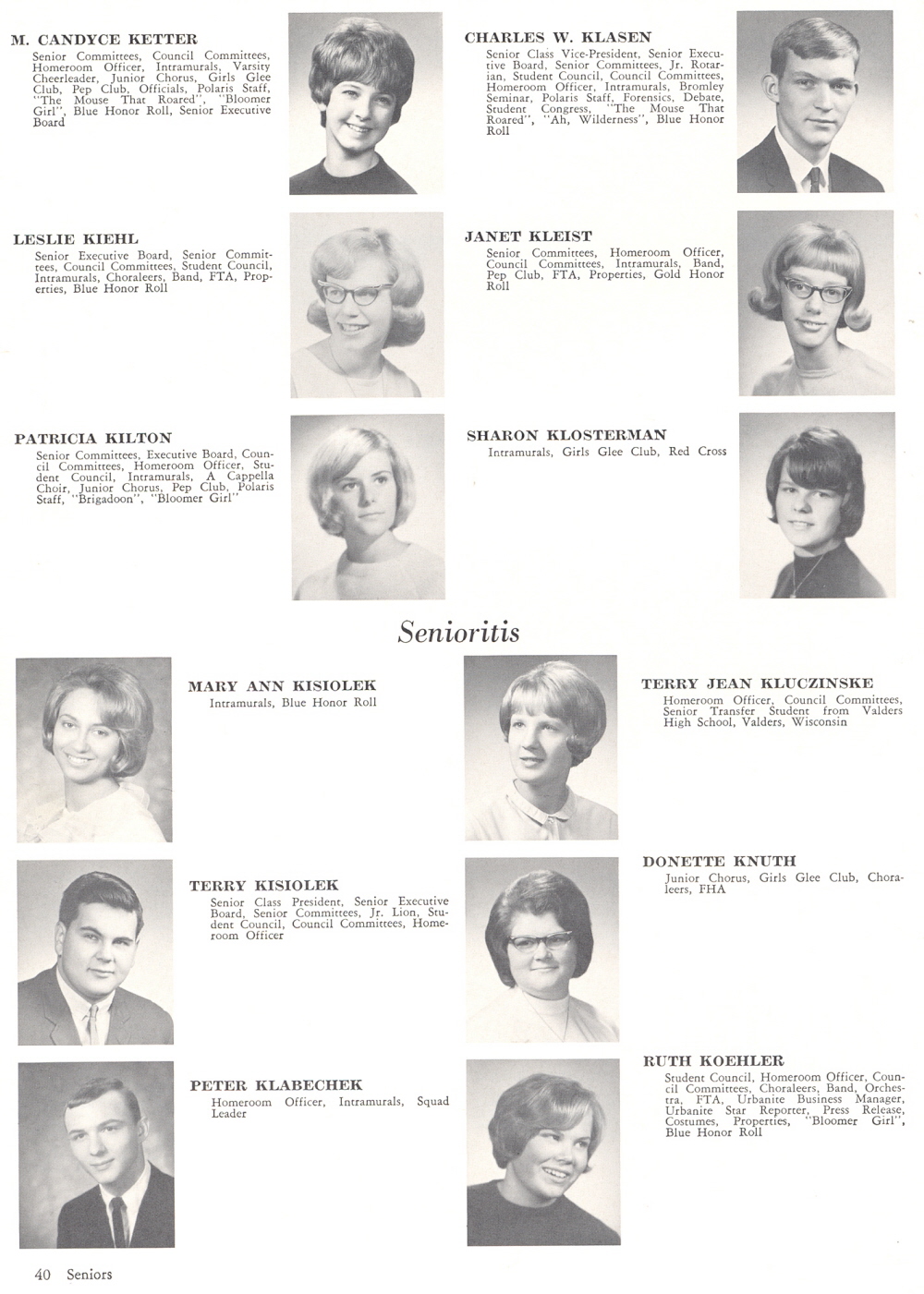 1966 Sheboygan North High School, Page 40: M. Candyce Ketter, Leslie Kiehl, Patricia Kilton, Mary Ann Kisiolek, Terry Kisiolek, Peter Klabechek, Charles W. Klasen, Janet Kleist, Sharon Klosterman, Terry Jean Kluczinske, Donette Knuth, Ruth Koehler.