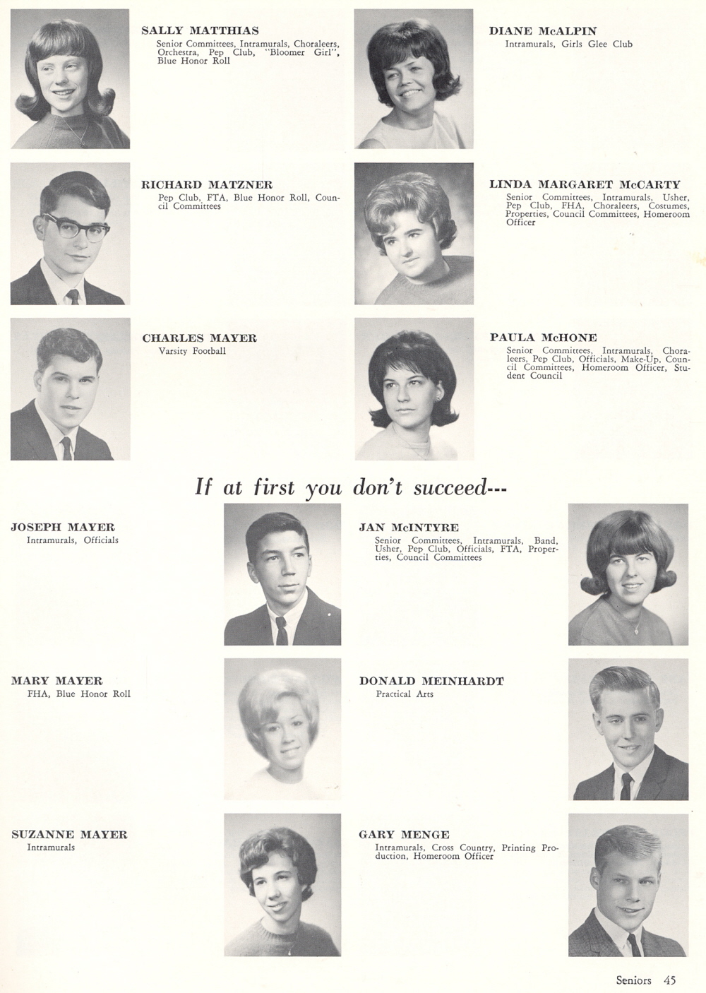 1966 Sheboygan North High School, Page 45: Sally Matthias, Richard Matzner, Charles Mayer, Joseph Mayer, Mary Mayer, Suzanne Mayer, Diane McAlpin, Linda Margaret McCarty, Paula McHone, Jan McIntyre, Donald Meinhardt, Gary Menge.