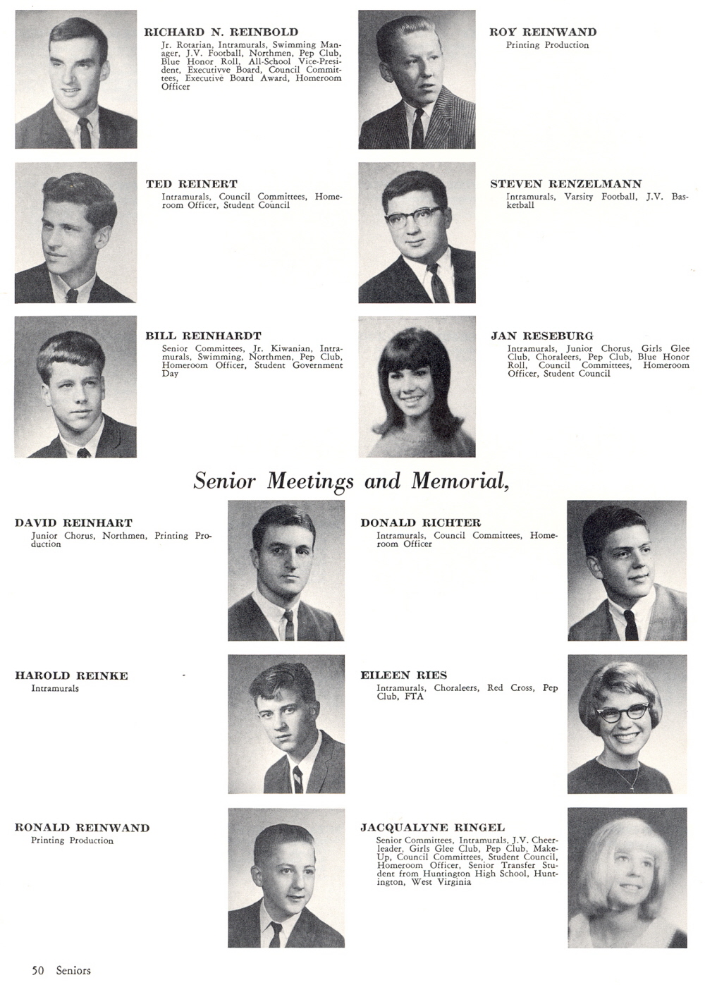 1966 Sheboygan North High School, Page 50: Richard N. Reinbold, Ted Reinert, Bill Reinhardt, David Reinhart, Harold Reinke, Ronald Reinwand, Roy Reinwand, Steven Renzelmann, Jan Reseburg, Donald Richter, Eileen Ries, Jacqualyne Ringel.