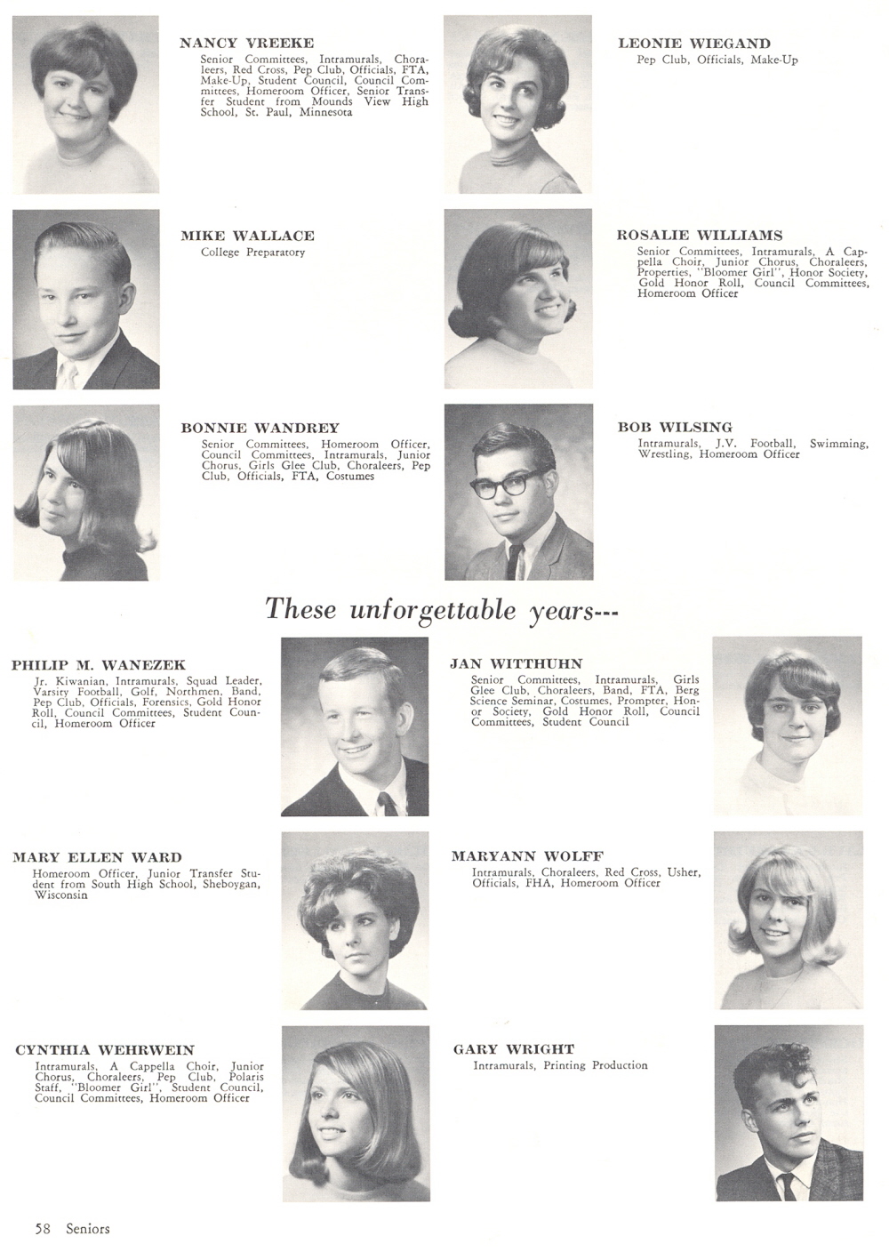 1966 Sheboygan North High School, Page 58: Nancy Vreeke, Mike Wallace, Bonnie Wandrey, Philip M. Wanezek, Mary Ellen Ward, Cynthia Wehrwein, Leonie Wiegand, Rosalie Williams, Bob Wilsing, Jan Witthuhn, Maryann Wolff, Gary Wright.
