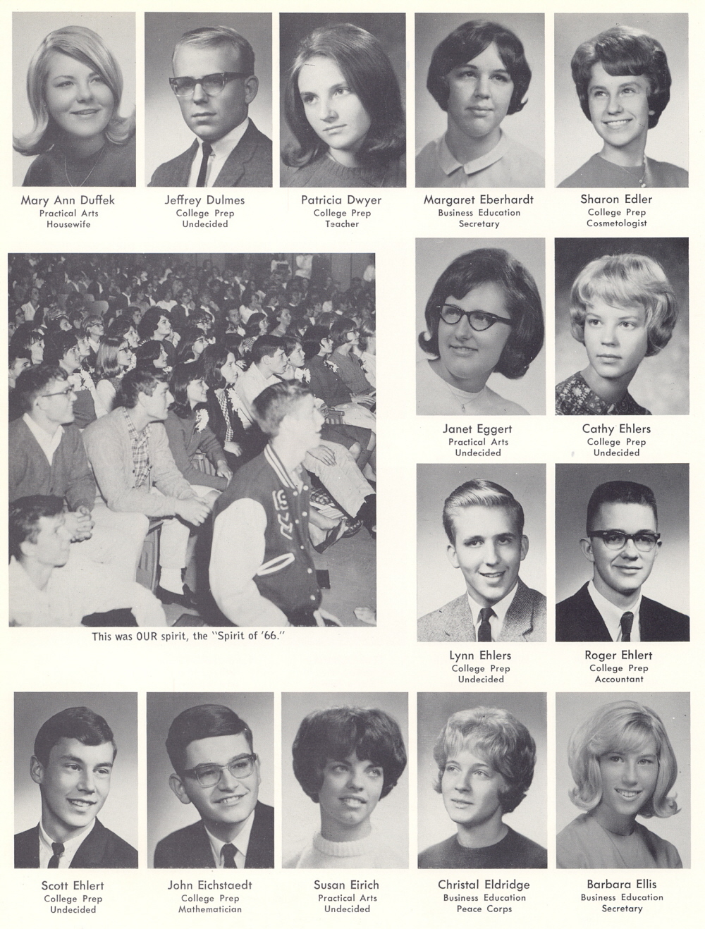 High School, Page 42: Mary Ann Duffek, Jeffrey Dulmes, Patricia Dwyer, Margaret Eberhardt, Sharon Edler, Janet Eggert, Cathy Ehlers, Lynn Ehlers Roger Ehlert, Scott Ehlert, John Eichstaedt, Susan Eirich, Christal Eldridge, Barbara Ellis.