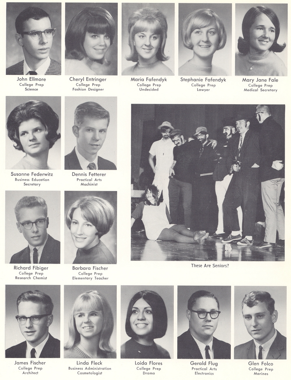 High School, Page 43: John Ellmore, Cheryl Entringer, Maria Fafendyk, Stephanie Fafendyk, Mary Jane Fale, Susanne Federwitz, Dennis Fetterer, Richard Fibiger, Barbara Fischer, James Fischer, Linda Fleck, Loida Flores, Gerald Flug, Glen Folco.