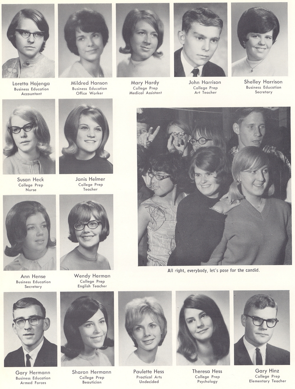 1966 Sheboygan South High School, Page 46: Loretta Hajenga, Mildred Hanson, Mary Hardy, John Harrison, Shelley Harrison, Susan Heck, Janis Helmer, Ann Hense, Wendy Herman, Gary Hermann, Sharon Hermann, Paulette Hess, Theresa Hess, Gary Hinz.