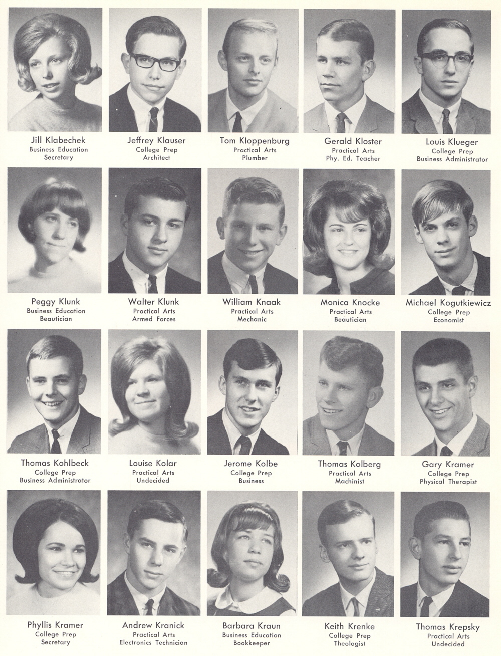 High School, Page 49: Jill Klabechek, Jeffrey Klauser, Tom Kloppenburg, Gerald Kloster, Louis Klueger, Peggy Klunk, Walter Klunk, William Knaak, Monica Knocke, Michael Kogutkiewicz, Thomas Kohlbeck, Louis Kolar, Jerome Kolbe, Thomas Kolberg, Gary Kramer, Phyllis Kramer, Andrew Kranick, Barbara Kraun, Keith Krenke, Thomas Krepsky.