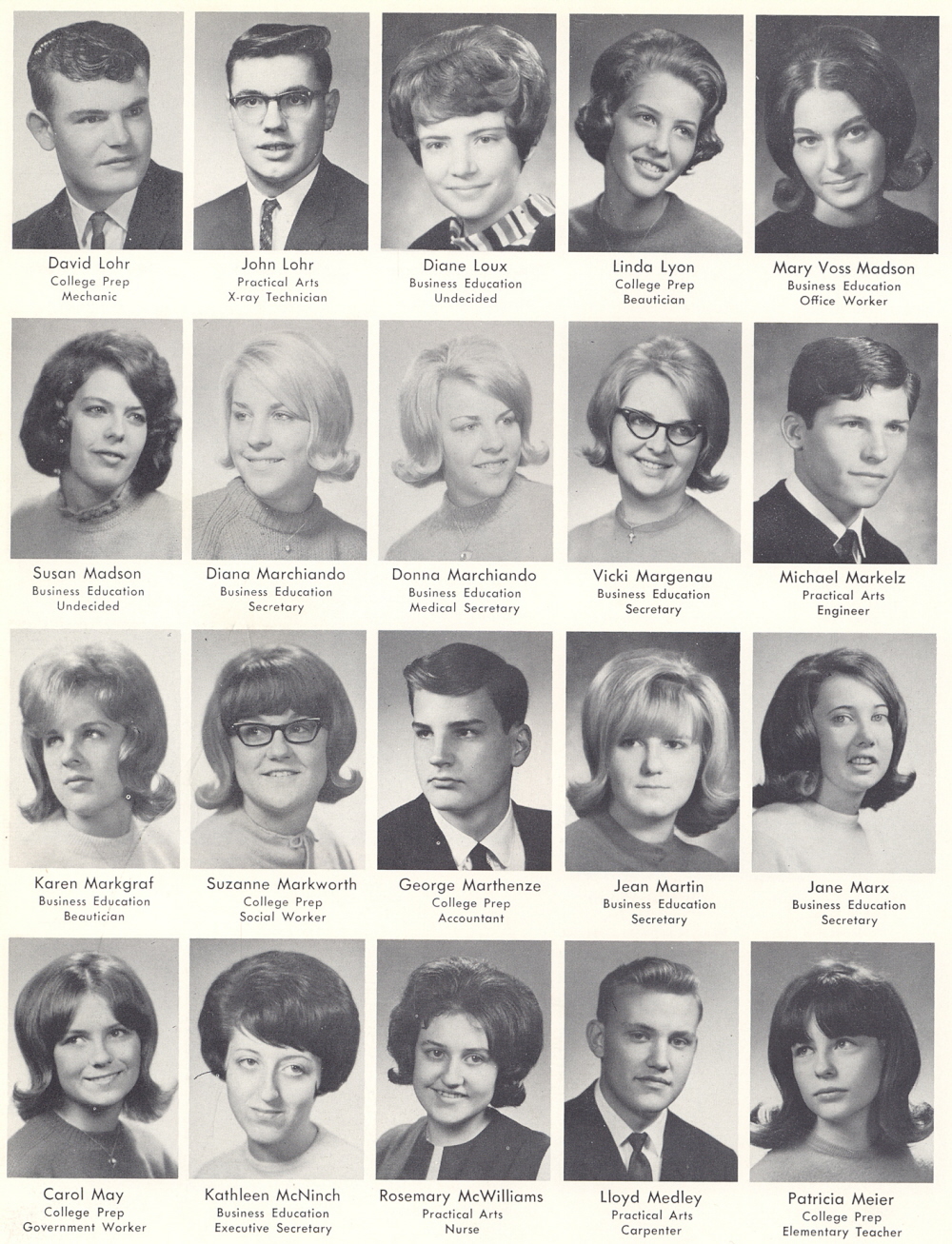 High School, Page 52: David Lohr, John Lohr, Diane Loux, Linda Lyon, Mary Voss Madson, Susan Madson, Diana Marchiando, Donna Marchiando, Vicki Margenau, Michael Markelz, Karen Markgraf, Suzanne Markworth, George Marthenze, Jean Martin, Jane Marx, Carol May, Kathleen McNinch, Rosemary McWilliams, Lloyd Medley, Patricia Meier.