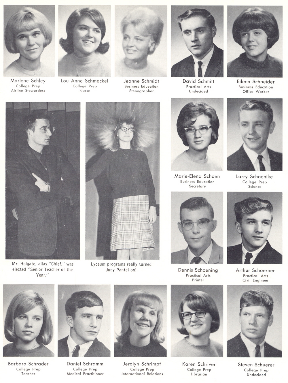 High School, Page 58: Marlene Schley, Lou Anne Schmeckel, Jeanne Schmidt, David Schmitt, Eileen Schneider, Marie-Elena Schoen, Larry Schoenike, Dennis Schoening, Arthur Schoerner, Barbara Schrader, Daniel Schramm, Jerolyn Schrimpf, Karen Schriver, Steven Schuerer.