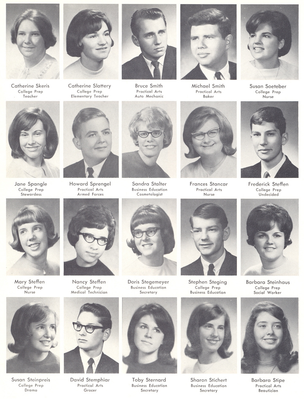 High School, Page 60: Catherine Skeris, Catherine Slattery, Bruce Smith, Michael Smith, Susan Soeteber, Jane Spangle, Howard Sprengel, Sandra Stalter, Frances Stancar, Frederick Steffen, Mary Steffen, Nancy Steffen, Doris Stegemeyer, Stephen Steging, Barbara Steinhaus, Susan Steinpreis, Davis Stempihar, Toby Sternard, Sharon Stichert, Barbara Stipe.