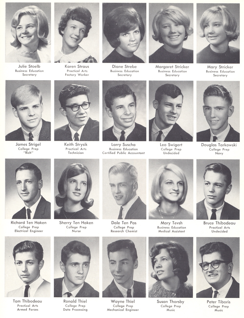 High School, Page 61: Julie Stoelb, Karen Straus, Diane Strebe, Margaret Stricker, Mary Stricker, James Strigel, Keigh Strysik, Larry Suscha, Leo Swigert, Douglas Tarkowski, Richard Ten Haken, Sherry Ten Haken, Dale Ten Pas, Mary Tevsh, Bruce Thibodeau, Tom Thibodeau, Ronald Thiel, Wayne Thiel, Susan Thorsby, Peter Tiboris.
