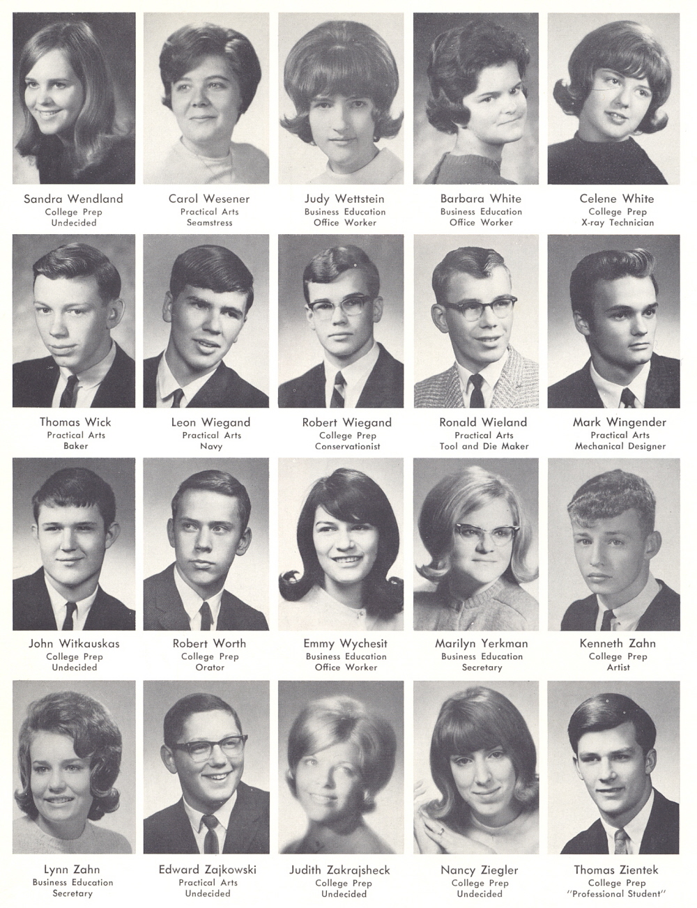 High School, Page 64: Sandra Wendland, Carol Wesener, Judy Wettstein, Barbara White, Celene White, Thomas Wick, Leon Wiegand, Robert Wiegand, Ronald Wieland, Mark Wingender, John Witkauskas, Robert Worth, Emmy Wychesit, Marilyn Yerkman, Kenneth Zahn, Lynn Zahn, Edward Zajkowski, Judith Zakrajsheck, Nancy Ziegler, Thomas Zientek.