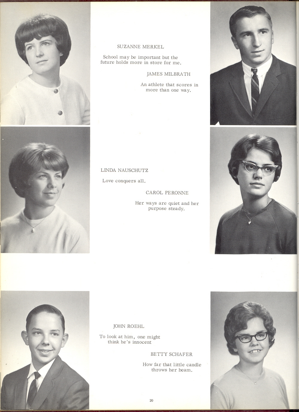 1967 Howards Grove High School, Page 20: Suzanne Merkel, James Milbrath, Linda Nauschutz, Carol Peronne, John Roehl, Betty Schafer.
