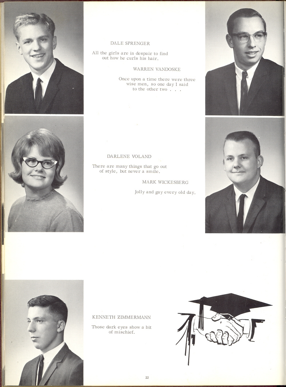 1967 Howards Grove High School, Page 22: Dale Sprenger, Warren Vandoske, Darlene Voland, Mark Wickesberg, Kenneth Zimmermann.