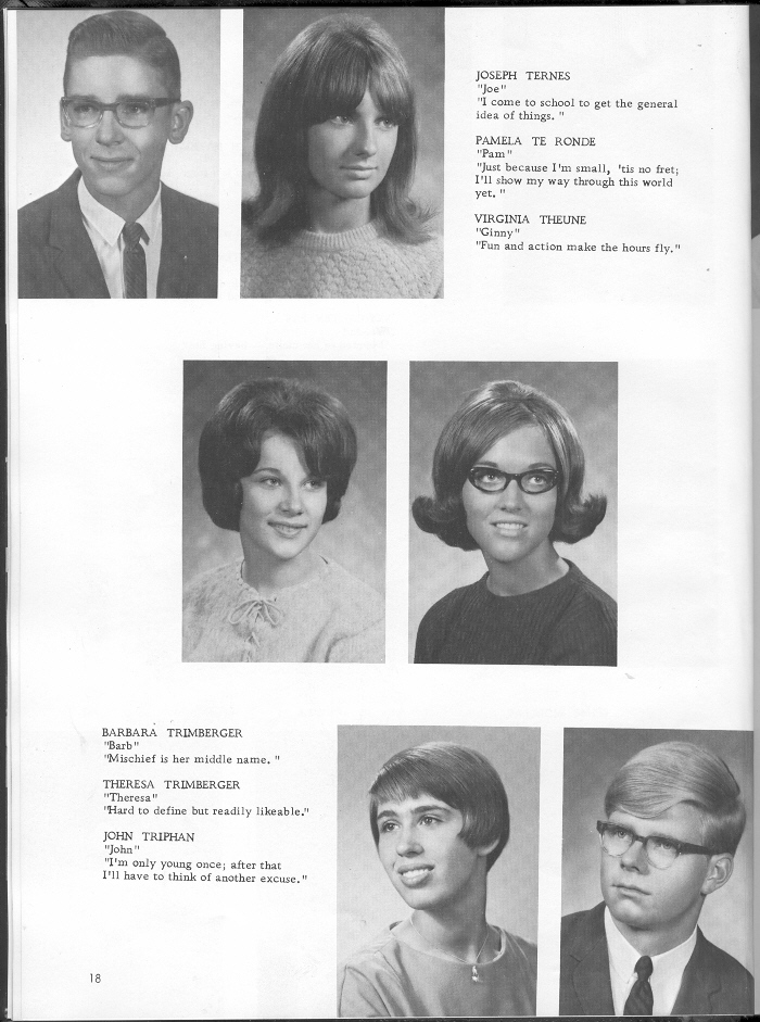 1967 Oostburg High School, Page 18: Joseph Ternes, Pamela Te Ronde, Virginia Theune, Barbara Trimberger, Theresa Trimberger, John Triphan.