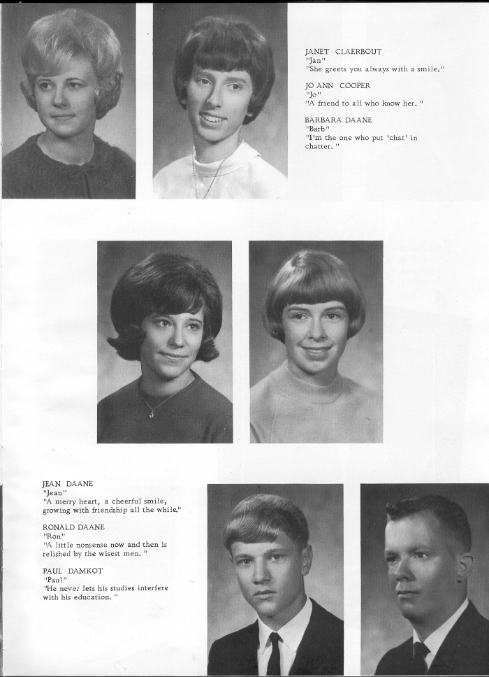 1967 Oostburg High School, Page 7: Janet Claerbout, Jo Ann Cooper, Barbara Daane, Jean Daane, Ronald Daane, Paul Damkot.