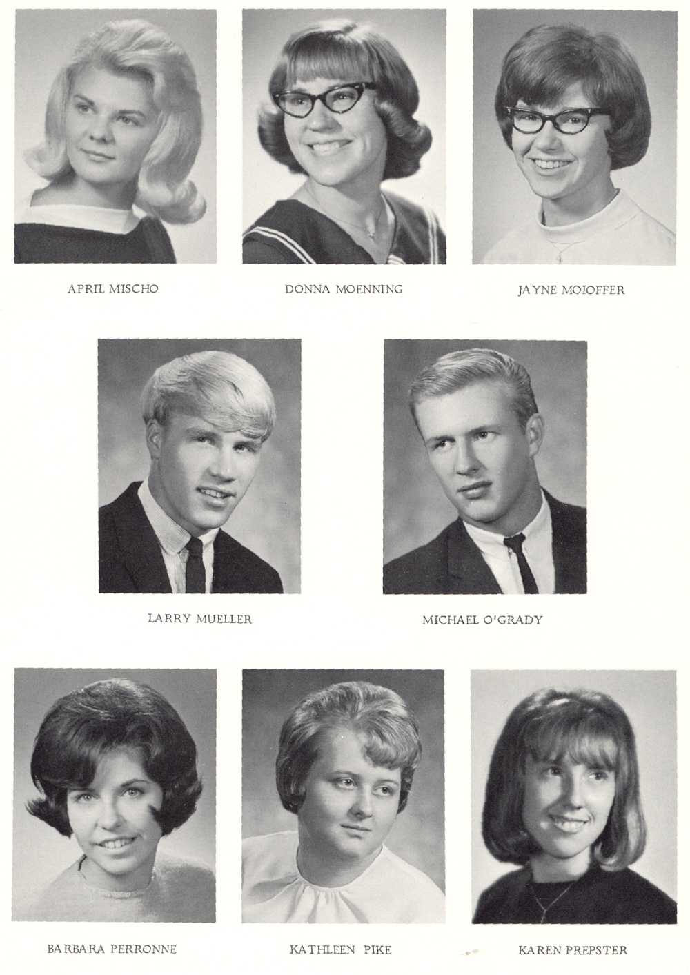 1967 Sheboygan Falls High School, Page 16: April Mischo, Donna Moenning, Jayne Moioffer, Larry Mueller, Michael O'Grady, Barbara Perronne, Kathleen Pike, Karen Prepster.