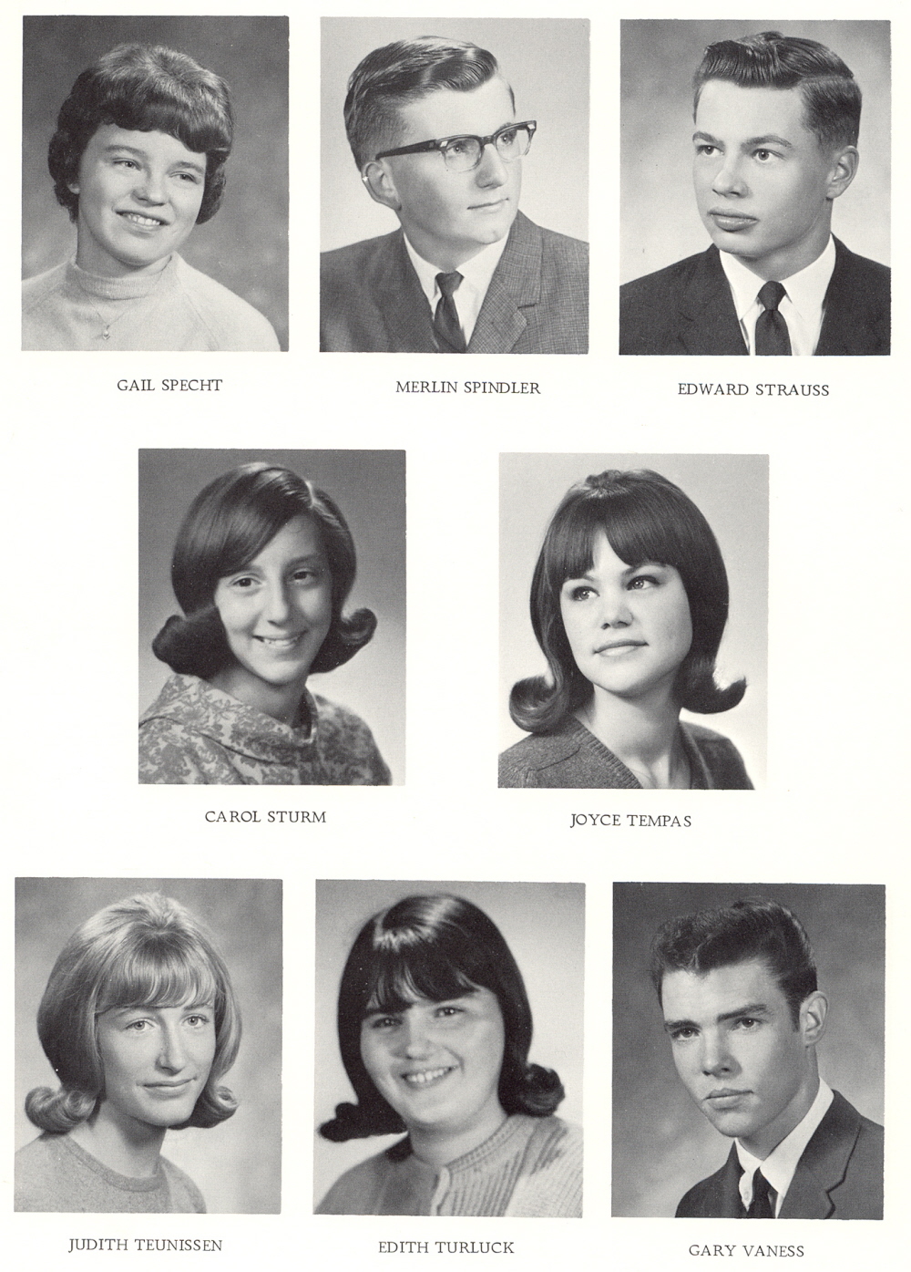 1967 Sheboygan Falls High School, Page 20: Gail Specht, Merlin Spindler, Edward Strauss, Carol Sturm, Joyce Tempas, Judith Teunissen, Edith Turluck, Gary Vaness.