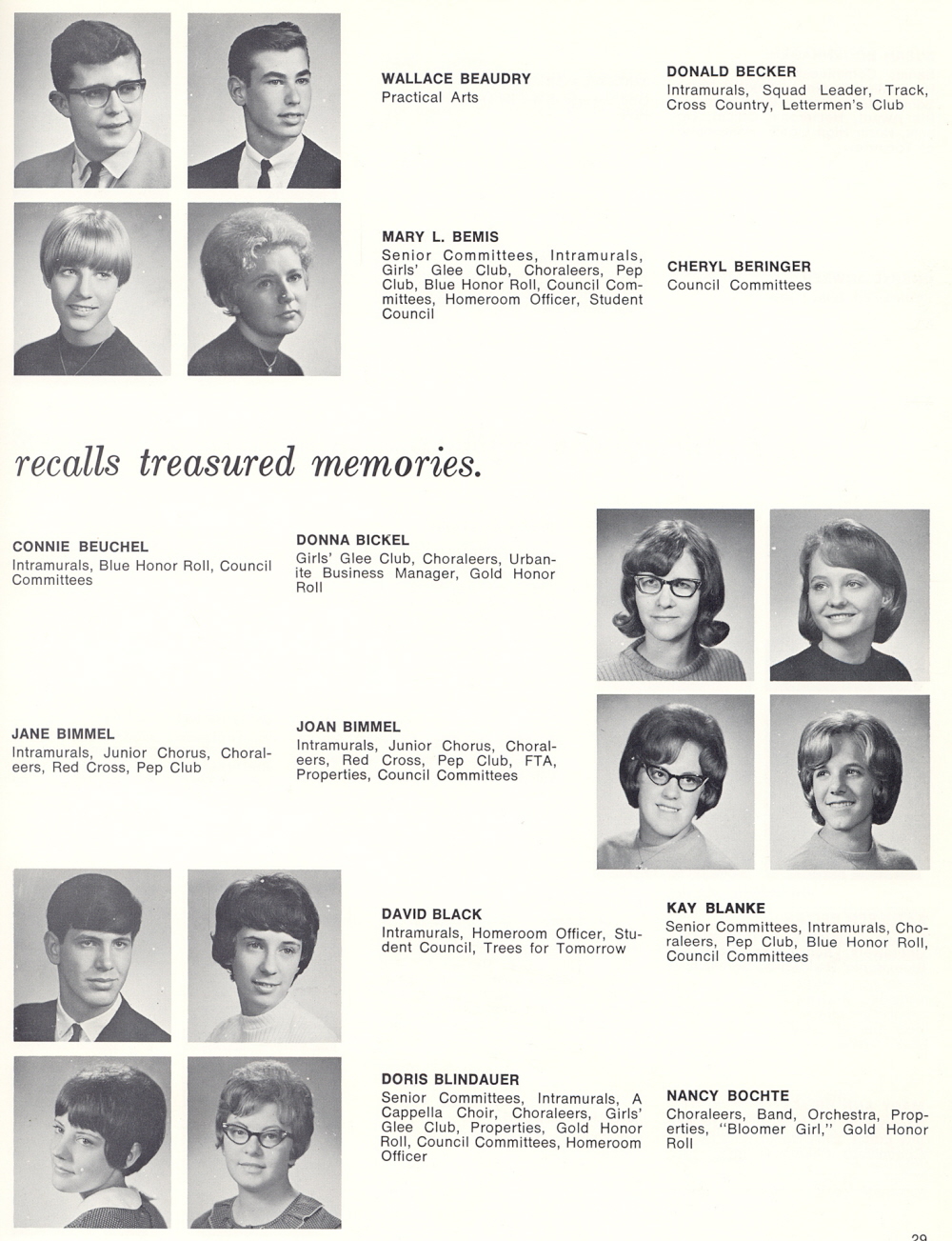 1967 Sheboygan North High School, Page 29: Wallace Beaudry, Donald Becker, Mary L. Bemis, Cherly Beringer, Connie Beuchel, Donna Bickel, Jane Bimmel, Joan Bimmel, David Black, Kay Blanke, Doris Blindauer, Nancy Bochte.