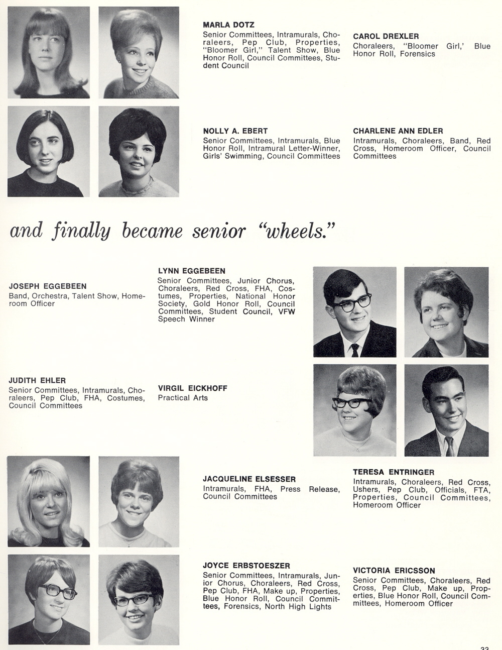 1967 Sheboygan North High School, Page 33: Marla Dotz, Carol Drexler, Nolly A. Ebert, Charlene Ann Edler, Joseph Eggebeen, Lynn Eggebeen, Judith Ehler, Virgil Eickhoff, Jacqueline Elsesser, Teresa Entringer, Joyce Erbstoeszer, Victoria Ericsson.