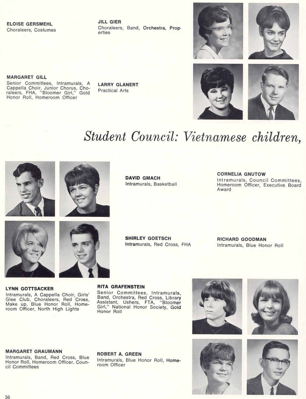 1967 Sheboygan North High School, Page 36: Eloise Gersmehl, Jill Gier, Margaret Gill, Larry Glanert, David Gmach, Cornelia Gnutow, Shirley Goetsch, Richard Goodman, Lynn Gottsacker, Rita Grafenstein, Margaret Graumann, Robert A. Green.